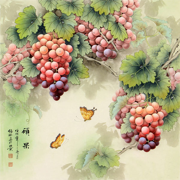 画面中,葡萄藤从上方垂下,错落有致的葡萄串分布在画面的各个角落,形成视觉焦点。两只蝴蝶位于画面中间偏下的空白处,打破了画面的单调。背景以淡墨和浅绿渲染出朦胧的叶影,简洁而富有层次感,突出了葡萄和蝴蝶,整体布局疏密得当,给人以和谐之感。葡萄多籽,在传统文化中象征着多子多福、人丁兴旺,同时也寓意着丰收与富足,代表着财富和好运源源不断。蝴蝶则象征着美好的爱情和幸福的生活,整幅画传达出家庭美满、生活富裕的美好祝愿。挂在餐厅,寓意饮食无忧、生活丰盛。表达对其生活幸福、财运亨通的美好祝福。