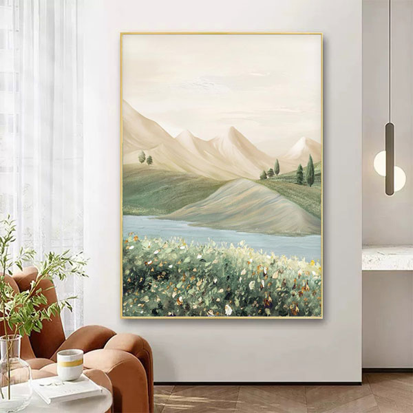 高级感背靠金山客厅油画_高档竖版山水画_大幅日照正对...